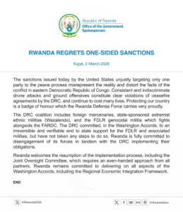 Leta y’u Rwanda ivuga ko Leta Zunze Ubumwe za Amerika, zirengagije indege zitagira abapilote (Drones), za Leta ya Congo, zakomeje kwataka abaturage zirenze ku masezerano yari yasinywe hagati y’impande zombi ahubwo ibyo bihano bikarebo z’u Rwanda. Muri iryo Tangazo kandi Leta y’u Rwanda yanditse ati:”Kurinda Igihugu cyacu , ni ikimenyetso cy’icyubahiro ingabo z’u Rwanda ‘Rwanda Defense Force’ zikorana ishema“.