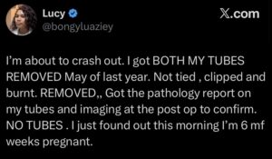 Gusa ngo n’ubwo bimeze bityo, yatunguwe no gusanga itwite inda y’amezi atandatu ni ikuvuga ibyumweru 26 ibintu byamuteye urujijo rwinshi cyane. Mu butumwa bwe yanditse ati:”Byandenze. Nakuyemo imiyoborantanga yanjye yombi mu mwaka washize. Si ukuyifunga cyangwa kuyikata, yakuyemo burundu kandi mfite ibimenyetso byose bishoboka ariko uyu munsi mfite inda y’Amezi 6”.